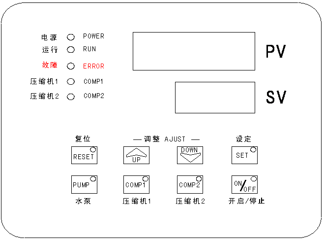 〔1〕若出現故障現象,“PV”區顯示“Err”,“SV”區顯示故障代碼,按一下“RESET”可以消音;故障排除後,再按一下“RESET”鍵複位後恢複正常運行。(注:如出現出水溫度過低故障,須在故障排除後按ON/OFF鍵重新開啟,才能恢複正常運行。)