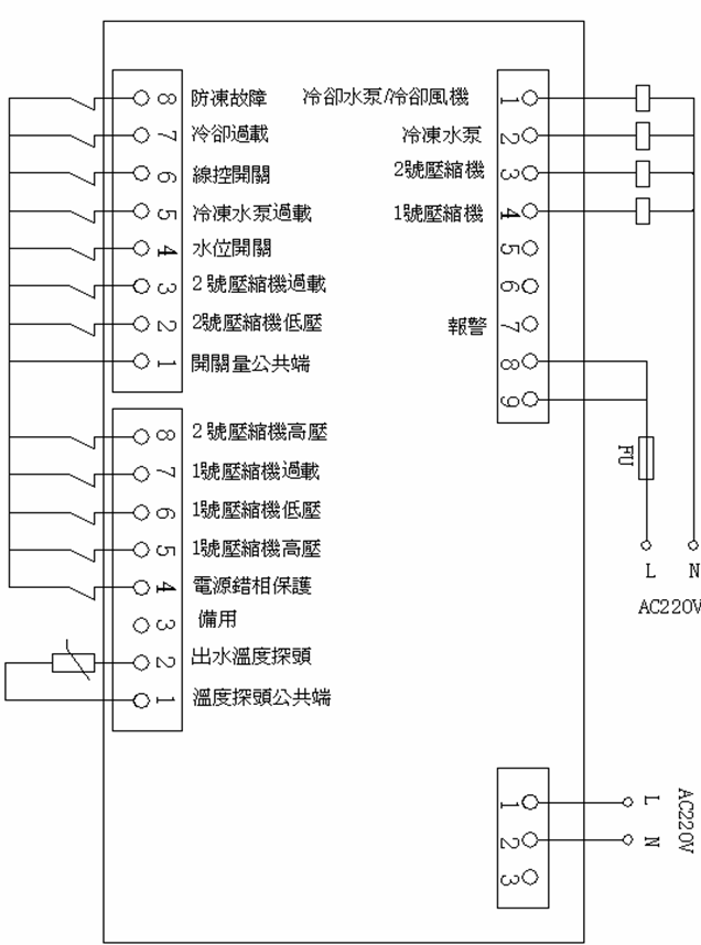 電源是采用三相五線,電壓380~415V/50HZ電源相位線分別為R、S、T,中性線(零線)N,接地導線為雙色線用E表示;機內設有錯缺相保護器,當在第一次開機時出現不亮燈或亮紅燈並顯示故障代碼及警號時,可將相線任意兩相對換接妥後合上開關即可;3HP以下冷凍機采用單相電源,電壓220-240V/50HZ電源相位線為L,中線為N,地線為E。]
